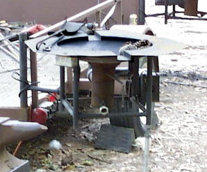 Forge pans were made from the ends of a discarded hot water heater. In the center a "pot" was made about 6-7" in dia and 3" deep. The tywer is made from a big weld "T" with a counter balanced ash dump. The clinker breaker is fabricated from round disks welded to the cross bar. | |||