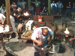 Second Heat Doug Merkel in front with Tom Clark as fireman. Left rear is Mark Linn with his son Mike as fireman. Off to the left is Tal Harris with his wife Kim as fireman. After the second heat Big Bob counted the nails and added points for various things and declared a three way tie between Tom Clark, Doug Merkle and Tal Harris. On my suggestion all the contestants used Tom's anvil (and fuel) for the remach to prevent any claims of unfairness. |