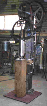 Hammer mass -- 30kg (66 lb) Anvil mass -- 200 kg (175*175*800mm solid bar) - clamped to column with a block of wood in between Speed -- 180 /min Motor -- 960 rpm 3hp (probably too big, butit was available) Hammer slide -- 2 off 20mm square brass bars Flywheel stroke -- 160 mm Spring -- 4 leaves 5mm by 45mm -- 600 mm semicircle - precompressed 10% Column - 4" by 6" m/steel - absolutely no sign of flexing |