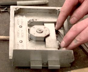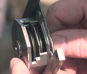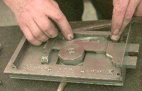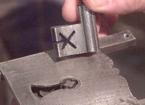 Locks of this style depended on complicated patterns of warding and trickery to avoid picking. But theives of the day could easily pick the simple mechanism which only required getting around the wards. It wasn't until the invention of the lever tumbler in 1788 by Robert Barron of England that locks had real security against picking. Although we commonly think of lever tumbler locks as cheap old fashioned door locks today, bank safe deposit boxes still use them. Good lever tumbler locks are as secure as any good quality lock. Wards (left) are the plates that prevent another key from fitting into the lock. They also make a torturous path to make picking difficult. This lock has a relatively simple but unusual ward design. The "X" shape is silver soldered to a flat plate ward. On high art locks of this type the wards were often intricate patterns built of thin brass plate and the slots sawn in the key with a jewler's saw. This lock also has a rare pin and bushing ward that must rotate with the key. |