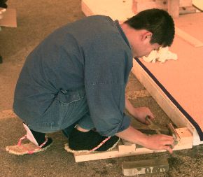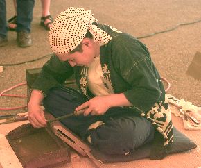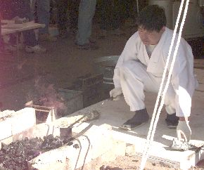 Notice the striker standy by with a very long handled sledge. Traditional Japanese hammers and sledges have the handle set way back in the head. This style of hammer was traditional World wide at one point. It is still used by western crafts people for certain types of work but has generaly been replaced by hammers with the handle nearly centered. |