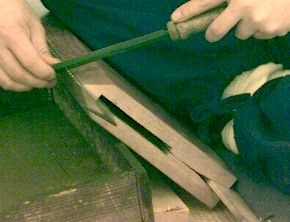Japanese Smith filing teeth in a saw blade held in a wooden wedge operated vise.