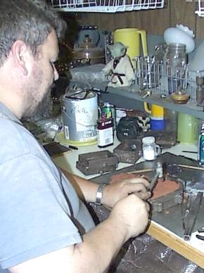Allan Bauldree a Kentucky Armourer spent the weekend demonstrating casting brass parts. Wax originals were carved and then cast using "Delft Clay" a proprietary casting sand used by jewelers. LEFT: Allan ramming sand into the flask. Tightly packing the sand is key to accurate reproduction of detail and a fine finish. |