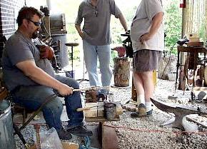 The flask in use here is a two piece cast iron unit with dowel pins and a pouring cup for the sprue. Among the items poured were decorative fluer-de-lis, rosette and skull rivits to use on armor. |