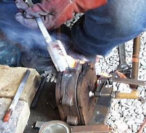 An oxy-acetylene torch was used to melt the brass in a jeweler's pouring bowl. A permanent clamp on handle was used instead of pouring tongs but either would work. As the brass was melted it was fluxed with borax and stired with a graphite rod. |