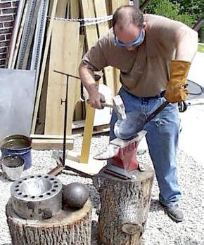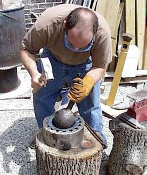 Here he is making a shield boss by hot sinking it into a form using a ball stake "hammer".