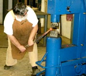 anvilfire guru forging ball on the NEW BigBLU QC-155 hammer at the NC-ABANA meet at Oak Hill Ironworks.
