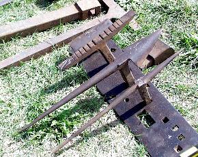 In the rear are two stake holding arms. On the rack there is a needle case stake, a blow horn stake and an edging stake. This is just one of at least three or four sets I saw. See Page 7 for another set of stakes. |