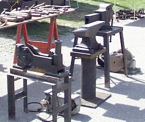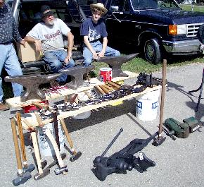 holding court at a table loaded with anvils, hammers, vises and misc. tools.