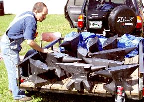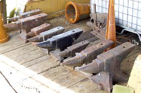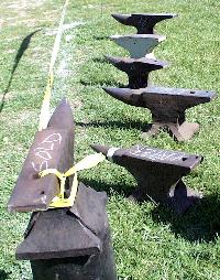 Steve Feinstein the owner of Euroanvils is wiping off the morning dew and putting a little wax on his load of anvils. ALL were gone by the end of the weekend. NEW, the Euroanvils sell for the same or less than some of the old used anvils. They are well made cast steel, machined and heat treated to Steve's Euroanvil spec. |