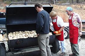 About the time this huge batch of barbque chicken got hot the smell started wafting into the shop and Zeevik complained that he couldn't concentrate! A definite distraction! The cook crew, Paul Garrett, Ted Thompson and Steve Barringer. Great job guys! |