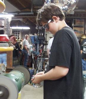 At left Sean is dishing a piece of 16ga steel using Allan's big ball hammer on the stump. Below left Sean is polishing his test sample. Sean is one of the youngest blacksmiths in our group and has several demos to his credit on our iForge page. |