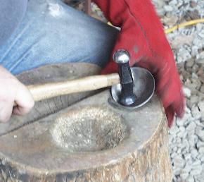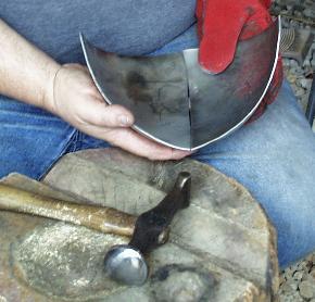 I learned a lot watching Alan this year. He shapes thick plate surprisingly fast with clean smooth results. Alan uses the heaviest largest radius hammer that suits the job and uses careful overlaping blows that shape the metal smoothly without a lot of bumps to work out by planishing. A pair of gauntlets made this day were completed without planishing and were ready to polish direct from the heavy dishing on the stump. This is a HUGE time saver. This is not to say that Alan does not planish his work. When needed his planishing leaves a near polished surface. |
