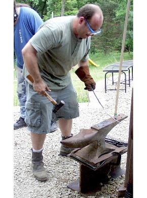 Ted and Jeff (at the anvil) know better but they are ARMOURERS and little forging goes on in their shop. The good stump is probably being used elsewhere. I think I caught Jeff doing something like this the hard way last year too ;) |