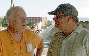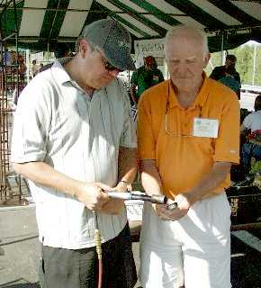 I had an enjoyable breakfast with Michael Porter on Wednesday morning. Among other things we discussed forge burners (of course), the future of gas forges world wide and the problems of the world. I had a brief discussion with Jack Andrews about digital cameras and video editing. To keep on top of things today requires an amazing range of knowledge. Left, Anvil Stand ;) |