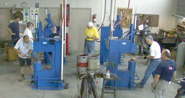 Four Big BLU Hammers, four NC forges, four anvils, 8 students and hundreds of pounds of cut steel. |