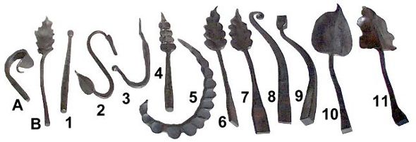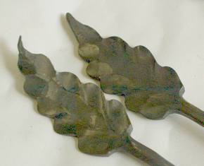Element #9 was forged from 1" (24.5mm) square bar. A block was isolated on the end and then the bar tapered. Elements #10 and #11 are leaves forged from 1" square bar. A bud is first formed exactly like hand forging a leaf, then using crown dies the leaf is spread sideways. The crown dies are so efficient in their directional shaping that a theoretical 1/4" thick by 4" width can be created. |