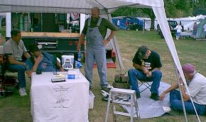 Jim "Paw-Paw" Wilson's tent became CSI headquarters during the day Friday. Left, Rich Waugh, Paw-Paw seated, Tony Bartol, Bob Harisim seated knaping, and Stephen Gensheimer far right. |