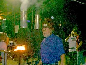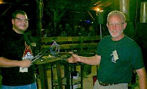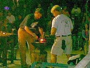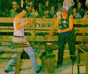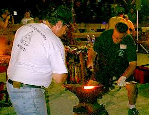 Ted cold forged the 3/8" section on my advice and finished a near perfect ring in record time. Drawing out the larger piece was ALMOST completed in time. . . Other teams included Patrick Nowak another anvilfire regular. The winning team was two fellows that had never met until the contest. They managed to make two fairly round rings about the smae size. A tough contest! |