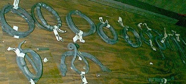 The goal of the contest was for a two person team to forge two rings of equal inside diameter from a piece of 3/8" square by 18" long and a piece of 3/4" round 12" long. 20 minutes was allowed and the larger pieces were preheated. No measuring tools were allowed and the vise was only allowed for twisting. Material could not be cut off, overlapped at the ends or welded. The parts were to be judged on roundness, equality of ID, neatness of ends and decoration. |