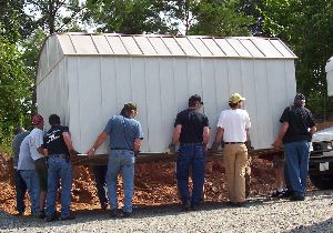Sometime you need some help from your friends. Dave Baker built this 10 x 12 utility building in Paw-Paw's shop to keep out of the weather and have a flat surface to work on. Before the hammer-in a dozen friends helped move it. Photos by Jim McGinnis, Glenn Conner and Jock Dempsey. |