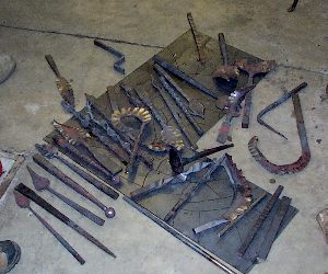 Results of a one hour demo. Leaves, pickets, ball finials, textured bars, abstract elements. . . All displaying the great versatility and productivity of the BigBLU Power Hammer. Not only do they make these hammers here they produce a large amount of architectural ironwork and furniture using the BigBLU's. |