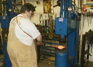 Freehand forging big hand sized leaves from 1" bar stock in a couple heats is a joy on the BigBLU. |