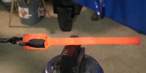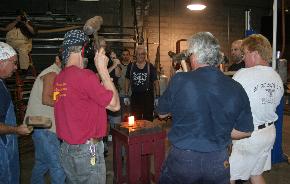 This is in preparation for upsetting the head of a large spike by gang or team striking (below). |