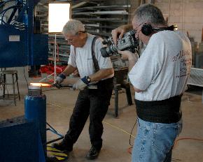 After several trial setups with a tripod it was decided to film each element using a hand held camera. Each piece was made three times so that it could be filmed from three different distances. All the forging was filmed in six hours of one day. Voice overs and explanations another day. It will take much longer to edit together. This video will be available from BigBLU hammers, anvilfire.com and a few others in mid September. |