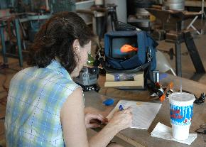 Rachel Baily editor of NOMMA'a Fabricator Magazine interviewing Hofi at the Power Hammer School.
