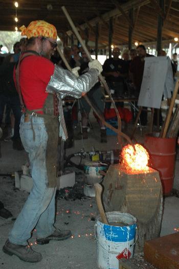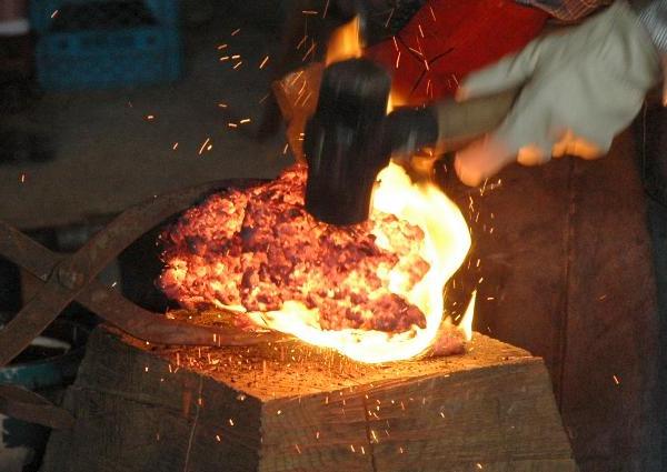 Much labor is required from this point to completely weld the bloom into a billet and force out excess slag.