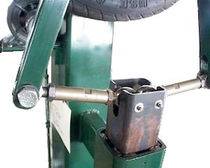 | Above: Tilting motor clutch. While many have moved away from this design it seems to give better feathering than others. The tire is nearly round so the angle of contact is not critical. | Above: Dupont style linkage. The use of the pillow block is very efficient and others attempts at replacing it have been complicated and expensive weldments. So why not spend the $20? The spring adjustments on this tire hammer use structural steel taper washers to compensate for the angle of the arms. | |