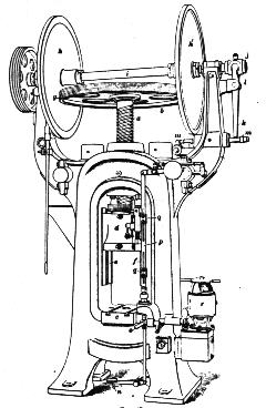These presses do not require any special foundation, as there is no jar or shock in their operation. They make strokes from 10 to 40 per minute and exert pressures from 25 to 1,800 tons. The screw press may be used for a great variety of hot or cold metal forgings. Besides open die forgings, metals may be extruded through dies, squirted up around the punch or formed in enclosed dies. -- J.K. Miller According to Grant Sarver, the late model machines he sells are more flexible and are good for all general operations except drawing. Images of some old manual flypresses |