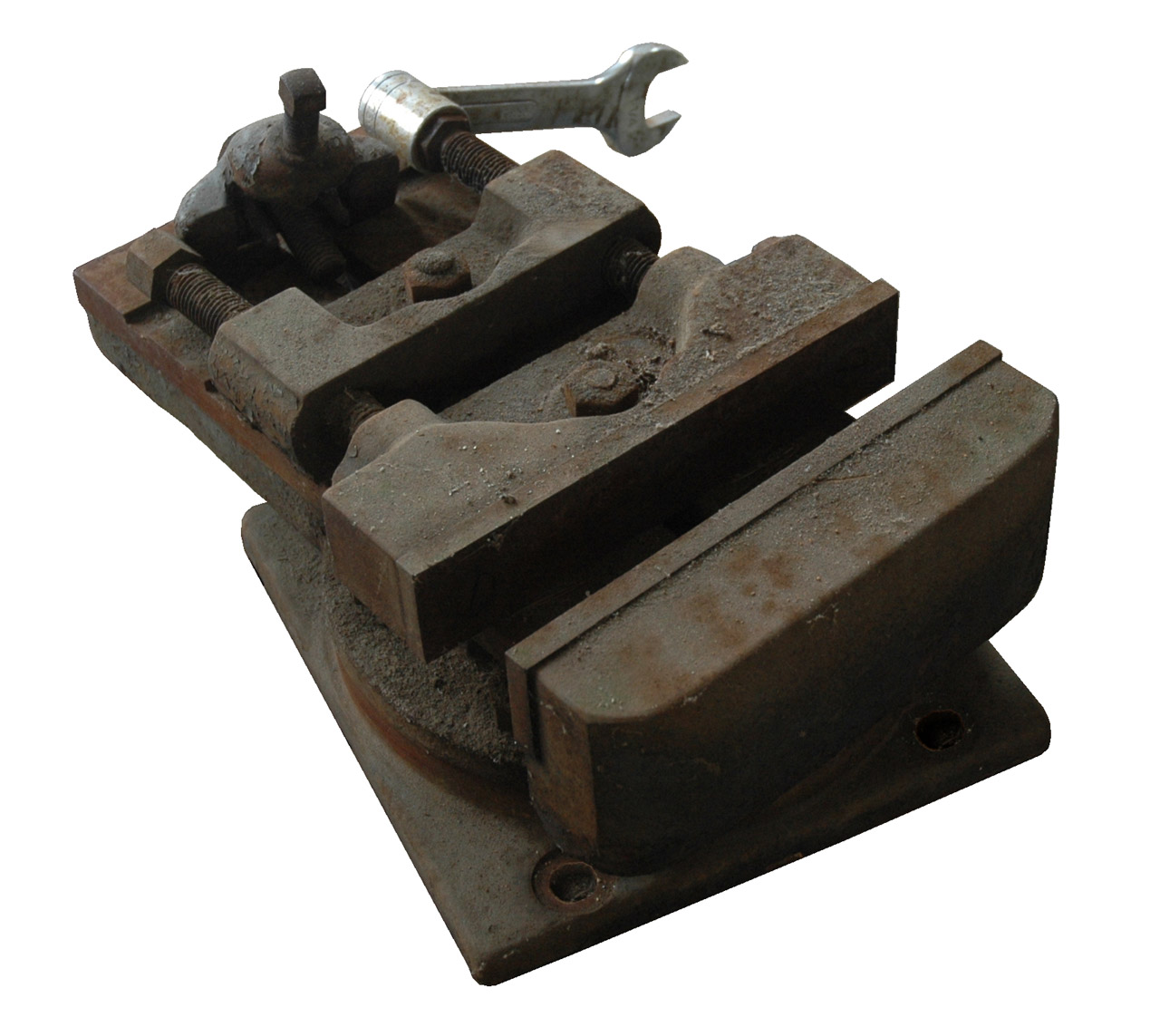 The wrench was custom made to fit the vise and shaper by welding together a socket and an open end wrench (spanner) using stainless welding rod.