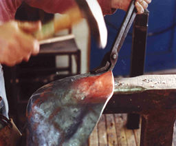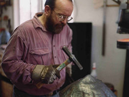 I continue around the peak. Note my look of ferocious concentration. Actually, I am cursing steadily under by breath, because a) the heat is slowly working through the thin leather glove on my left hand, and b) any slightly off-the-mark blow causes the bowl to try jumping off the peak stake. Many low heats, gentle tapping, and Zen-like detachment all contribute to success. |