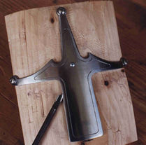 I sketch and cut out a paper template ("half" template, in this case) for a decorative crucifix-shaped nasal, and trace the pattern in ink on a piece of 10-gauge mild steel. This stock is about .130" thick (over 1/8"), so it will make a very strong nasal. Even on a Beverly B3 shear, it is a bear to cut! |