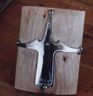 The nasal has to be held firmly while the inlay is cut and punched in. For simple shapes like this, wood works fine. I use a chunk of scrap 2x6, and shape it to fit the nasal back by eye, using a drawknife and rasp, and some trial fits. (Rest assured, if I can do this, you can...my woodworking skills are next to nonexistent.) A small piece of 2x2 screwed to the back provides a "handle" to grip in the vise. |