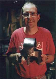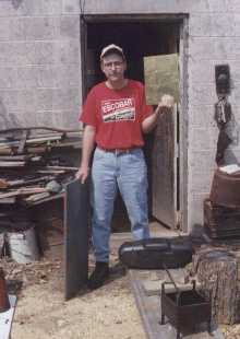 | 2) Tadgh poses with the raw material for the project: a scrapped piece of 16 gauge steel shelving and some new brass from Atlas Metal Works in Denver, Colorado.