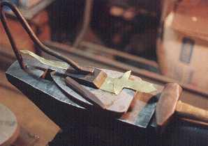 | 13) After trying various shears on the irregular lines of the heavy gauge brass, it was found that a hammer and cold chisel were faster. The aluminum backing plate came from a scrapped steam iron, and has proved remarkably durable. | ![]() |