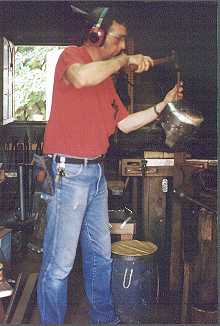 Subsequent to constructing the helm I obtained a copy of: The Anglian Helm from Coppergate by Dominic Tweddle; © York Archaeology Trust for Excavation and Research, 1992; Council for British Archaeology, 112 Kennington Road, London, SE11 6RE, Great Britain; ISBN 1 872414 19 2. This is a wonderful book, and comes complete with an analysis of contemporary and Anglo-Saxon helms. It also contains full-scale plans, enabling the more talented and ambitious to create a complete replica. In our version we left off the cheek pieces and the mail skirt for speed and simplicity. We also rotated the brow-band joint from front to rear for extra strength, to eliminate possibly irritating rivets in the forehead area, and because that’s the way I’ve always done it! We hope that this information will inspire Marklanders, Scadians and other medievalists in their own projects, and save them some time in the avoidance of mistakes. An earlier attempt at a helm that we tried may well end up as a riveted cook pot! |