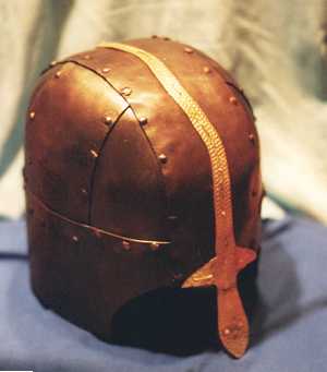 But there are other factors besides protection such as materials, weight, ease of fabrication, and general style. We decided on a simplified version of the mid to late 8th century Coppergate Helm, without the cheek pieces and mail neck guard, and less decorative brass. This both simplified the construction and avoided “authenticloning” where endless copies of a single artifact show up all over the reenactment battlefield. Uniforms and uniformity are not a dark ages trait. | |