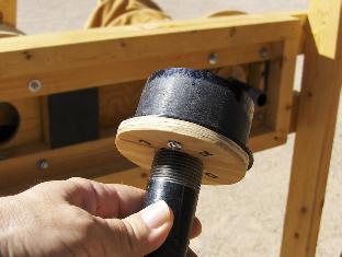 Simple adapter, consisting of a plastic drain cap, a plywood disk with a 1.25" hole in the center, and an iron pipe nipple screwed into the disk. Ugly, but fast and cheap. I'll make some better-looking versions next year.