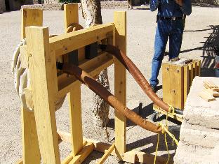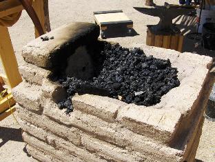 Me, getting into the bellows-monkey zone. With practice, you build up a rhythm that Bruce Blackistone described to me: start compressing lung B just a fraction of a second before lung A is fully compressed, and vice versa. You can get a fairly constant air blast. The fire is going well, and we have piled in a few adobe chunks in the hearth to allow us to keep the total fuel mass small. During the demo season, the hearth may be filled up with a big mass of coal; it will only burn at the tuyere end. (This picture shows the big mural on the south Presidio wall. It's meant to give an idea of the full size of the fort in its heyday.)