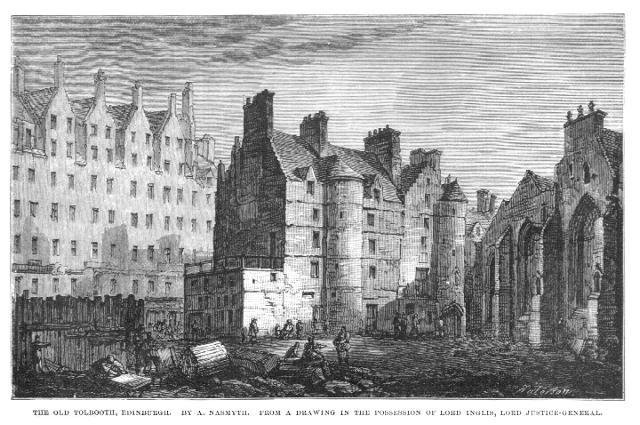 At one of the strongest parts of the building a strong oak chest, iron-plated, had been built in, held fast by a thick wall of stone and mortar on each side. The iron chest measured about nine feet square, and was closed by a strong iron door with heavy bolts and locks. This was the Heart of Midlothian, the condemned cell of the Tolbooth.[note: Long after the condemned cell had been pulled down, an English Chartist went down to Edinburgh to address a large meeting of his brother politicians. He began by addressing them as "Men of the Heart of Midlothian!" There was a loud guffaw throughout the audience. He addressed them as if they were a body of condemned malefactors.] The iron chest was so heavy that the large body of workmen could not, with all their might, pull it out. After stripping it of its masonry, they endeavoured by strong levers to tumble it down into the street. At last, with a "Yo! heave ho!" it fell down with a mighty crash. The iron chest was so strong that it held together, and only the narrow iron door, with its locks, bolts, and bars, was burst open, and jerked off amongst the bystanders. It was quite a scene. A large crowd had assembled, and amongst them was Sir Walter Scott. Recognising my father, he stood by him, while both awaited the ponderous crash. Sir Walter was still the Great Unknown. When his Heart of Midlothian was published in the course of the following year, it was pretty well known that he was the author of that fascinating novel. Sir Waiter got the door and the key, as relics, for his house at Abbotsford. There was a rush of people towards the iron chest to look into the dark interior of that veritable chamber of horrors. My father's artist friend went forward with the rest, and endeavoured to pick up some remnant of the demolished structure. As soon as the clouds of dust had been dispersed, he observed, under the place where the iron box had stood, a number of skeletons of rats, as dry as mummies. He selected one of these,[note: I was so much impressed with the events of the day, and also with the fact of the young artist having taken with him so repulsive a memento as a rat's skeleton, that I never forgot it. More than half century later, when I was at a private view of the Royal Academy, I saw sitting on one of the sofas a remarkable and venerable-looking old gentleman. On inquiring of my friend Thomas Webster who he was, he answered, "Why, that's old Linnell!" I then took the liberty of sitting down beside him, and, apologising for my intrusion on his notice, I said it was just fifty-seven years since I had last seen him! I mentioned the circumstance of the rat-skeleton which he had put in his pocket at Edinburgh. He was pleased and astonished to have the facts so vividly recalled to his mind. At last he said, "Well, I have that mummy rat, the relic of the Heart of Midlothian, safe in a cabinet of curiosities in my house at Redhill to this day."] wrapped it in a newspaper and put it in his pocket as a recollection of his first day in Edinburgh, and of the final destruction of the "Heart of Midlothian." This artist was no other than John Linnell, the afterwards famous landscape painter. He was then a young and unknown man. He brought a letter of introduction to my father. He also brought a landscape as a specimen of his young efforts, and it was so splendidly done that my father augured a brilliant career for this admirable artist. I had the pleasure of seeing Sir Waiter Scott on another and, to me, a very memorable occasion. From an early period of my schoolboy days I had a great regard for every object that had reference to bygone times. They influenced my imagination, and conjured up in my mind dreamy visions of the people of olden days. It did not matter whether it was an old coin or an old castle. took pleasure in rambling about the old castles near Edinburgh, many of them connected with the times of Mary Queen of Scots. Craigmillar Castle was within a few miles of the city; there was also Crighton Castle, and above all Borthwick Castle. This grand massive old ruin left a deep impression on my mind. the sight of its gloomy interior, with the great hall lighted up only by stray glints of sunshine, as if struggling for access through the small deep-seated windows in its massive walls, together with its connection with the life and times of Queen Mary, had a far greater influence upon my mind than I experienced while standing amidst the Coliseum at Rome. Like many earnest-minded boys, I had a severe attack at the right time of life, say from 12 to 15, of what I would call "the collecting period." This consisted, in my case, of accumulating old coins, perhaps one of the most salutary forms of this youthful passion. I made exchanges with my school companions. Sometimes my father's friends, seeing my anxiety to improve my collection gave me choice specimens of bronze and other coins of the Roman emperors, usually duplicates from their own collection. These coins had the effect of promoting my knowledge of Roman history. I read up in order to find out the acts and deeds of the old rulers of the civilised world. Besides collecting the coins, I used to make careful drawings of the obverse and reverse faces of each in an illustrated catalogue which I kept in my little coin cabinet. I remember one day, when sitting beside my father making a very careful drawing of a fine bronze coin of Augustus, that Sir Walter Scott entered the room. He frequently called upon my father in order to consult him with respect to his architectural arrangements. Sir Walter caught sight of me, and came forward to look over the work I was engaged in. At his request I had the pleasure of showing him my little store of coin treasures, after which he took out of his waistcoat pocket a beautiful silver coin of the reign of Mary Queen of Scots, and gave it to me as being his "young brother antiquarian." I shall never forget the kind fatherly way in which he presented it. I considered