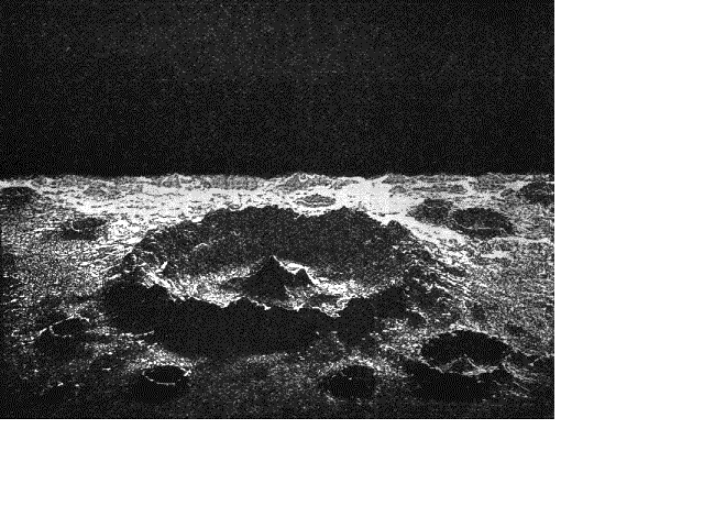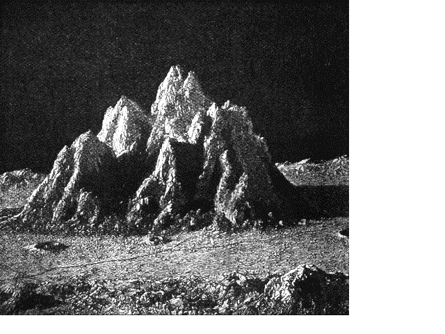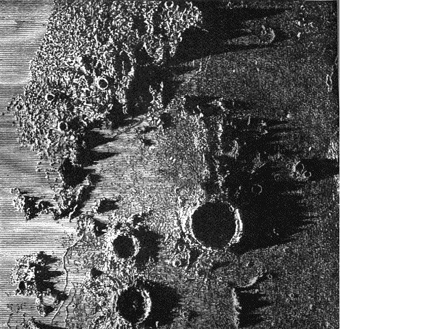NOTE These illustrations serve to illustrate one of the most potent of geological agencies which has given the earth's surface its grandest characteristics. I mean the elevation of mountain ranges through the contraction of the globe as a whole. By the action of gravity the former larger surface crushes down, as it were, the contracting interior; and the superfluous matter, which belonged to a bigger globe, arranges itself by tangential displacement, and accommodates itself to the altered or decreased size of the globe. Hence our mountain ranges, which though apparently enormous when seen near at hand are merely the wrinkles on the face of the earth. While earnestly studying the details of the moon's surface, it was a source of great additional interest to me to endeavour to realise in the mind's eye the possible landscape effect of its marvellous elevations and depressions. Here my artisic faculty came into operation. I endeavoured to illustrate the landscape. scenery of the Moon, in like manner as we illustrate the landscape scenery of the Earth. The telescope revealed to me distinctly the volcanic craters, the cracks, and the ranges of mountains -- by means of the light and shade on the moon's surface. One of the most prominent conditions of the awful grandeur of lunar scenery is the brilliant light of the sun, far transcending that which we experience upon the earth -- enhanced by the contrast with the jet-black background of the lunar heavens, -- the result of the total absence of atmosphere. One portion of the moon, on which the sun is shining, is brilliantly illuminated, while all in shade is dark. While the disc of the sun appears a vast electric light of overpowering rayless brilliancy, every star and planet in the black vault of the lunar heavens is shining with steady brightness at all times; as, whether the Sun be present or absent during the long fourteen days' length of the lunar day or night, no difference on the absolutely black aspect of the lunar heavens can appear. That aspect must be eternal there. No modification[note: a small degree of illumination is, however, given to some portions of the Moon's surface by the Earth-shine, when the earth is in such a position with regard to the Moon, as to reflect some light on to it, as the Moon does to the earth.] of the darkness of shadows in the Moon can result from the illuminative effect, as in our case in the earth, from light reflected into shadows by the blue sky of our earthly day The intensity of the contrast between light and shade must thus lend another awful aspect to the scenery of the Moon, while deprived of all those charming effects which artists term "aerial perspective," by which relative distances are rendered cognisable with such tender and exquisite beauty. The absence of atmosphere on the Moon causes the most distant objects to appear as close as the nearest; while the comparatively rapid curvature of the moon, owing to its being a globe only one-fourth the diameter of the earth, must necessarily limit very considerably the range of view.