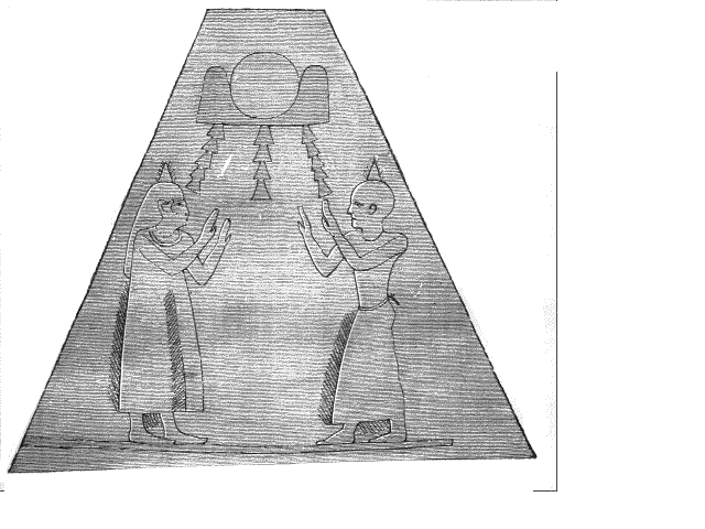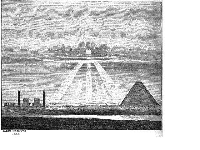 Go to previous chapter, a Chronological list of Mechanical Inventions and Technical Contrivances BEFORE I take my leave of the public, I wish to put on record my speculations as to the origin of two subjects of remote antiquity, viz. : the Sun-ray origin of the Pyramids, and the origin of the Arrow-head or Cuneiform Character. First, with respect to the Sun-ray origin of the Egyptian Pyramids. In pursuing a very favourite subject of inquiry, namely the origin of forms, no portion of it appears to me to be invested with so deep an interest as that of the Worship of the Sun, one of the most primitive and sacred foundations of adorative religion, -- affecting as it has done, architectural structures and numerous habits and customs which have come clown to us from remote antiquity, and which owe their origin to its influence. On many occasions, while beholding the sublime effects of the Sun's Rays streaming down on the earth through openings in the clouds near the horizon, I have been forcibly impressed with the analogy they appear to suggest as to the form of the Pyramid, while the single vertical ray suggests that of the Obelisk. In following up this subject, I was fortunate enough to find what appears to me a strong confirmation of my views, namely, that the Pyramid, as such, was a sacred form. I met with many examples of this in the Egyptian Collection at the Louvre at Paris; especially in small pyramids, which were probably the objects of household worship. In one case I found a small pyramid, on the upper part of which appeared the disc of the Sun, with pyramidal rays descending from it on to figures in the Egyptian attitude of adoration. This consists in the hands held up before the eyes -- an attitude expressive of the brightness of the object adored. It is associated with the brightness of the Sun, and it still survives in the Salaam, which expresses profound reverence and respect among Eastern nations. It also survives in the disc of the Sun, which has for ages been placed like a halo behind the heads of sacred and exalted personages, as may be seen in Eastern and early paintings, as well as in church windows at the present day. This is also intimately connected with lighted lamps and candles, which latter may often be met with in Continental churches, as well as in English Ritualist Churches at the present day. In Romish Continental churches they are stuck on to pyramidal stands, and placed before pictures and images of sacred personages. All such lighted lamps or candles are survivals of that most ancient form of worship, -- that of THE SUN! The accompanying illustrations will serve in some degree to confirm the correctness of my views as to this very. interesting subject.