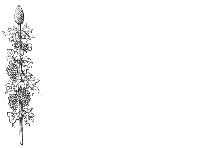 In connection with the worship of the Sun and other heavenly bodies, as practised in ancient times by Eastern nations, it may be mentioned that their want of knowledge of the vast distances that separate them from the earth led them to the belief that these bodies were so near as to exert a direct influence upon man and his affairs. Hence the origin of Astrology, with all its accompanying mystifications; this was practised under the impression that the Sun, Moon, and planets were near to the earth. The summits of mountains and "High Places" thus became "sacred," and were for this reason resorted to for the performance of the most important religious ceremonies. As the "High Places" could not be transported to the Temples, the cone-bearing trees, which were naturally associated with these elevated places, in a manner partook of their sacred character, and the fruit of the trees became in a like manner sacred. Hence the Fir Cone became a portable emblem of their sacredness; and, accordingly in the Assyrian Worship, so clearly represented to us in the Assyrian Sculptures in our Museums, we find the Fir Cone being presented by the priests towards the head of their kings as a high function of Beatification. So sacred was the Fir Cone, as the fruit of the sacred tree, that the priest who presents it has a reticule-shaped bag in which, no doubt, the sacred emblem was reverently deposited when not in use for the performance of these high religious ceremonies. The same emblem "survived" in the Greek worship. I annex a tracing from a wood engraving in Fellows's Researches in Asia Minor, 1852 (p. 175), showing the Fir Cone as the finial to the staff of office of the Wine-god Bacchus.