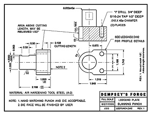The detail part drawing to the left is an "in-house" drawing for a one-off project. It is missing center marks and a cross section axis line. The view locations are also not standard. However, it has all the basics, border, title block, notes, dimensions with tolerances. Click image for an enlarged detail.