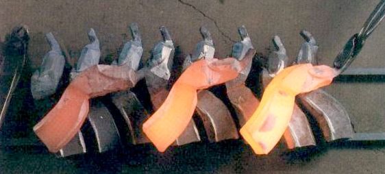 ![]() Completed pieces with aged finish. Many new smiths struggle with projects such as those on our anvilfire iForge page that seem to look simple. And when you actually watch a master smith making these pieces they indeed DO seem easy. But the reality is much different. "Simple" opperations like chiseling an ear do not go as planned and the metal cools too fast to punch both eyes in one heat. For the begining smith the frustration level can be very high. The practice gained by producing quantities of an item as shown here are what gives the master smith that easy of working with hot steel. This practice gives them the confidence and ability to work fast and do more per heat. When you watch them is seems the steel stays hot for a very long time, but when YOU try it the steel cools instantly. But the steel cools just as fast for the master as for the apprentice. RETURN TO REVIEW of The Italian Masters of Wrought Iron ALINEA editrice Firenze, Italy Distributed in North America by: ArtisanIdeas.com