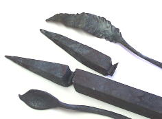 ![]() Samples forged on the EC-JYH. Above, two points in one inch square stock and a leaf by the Guru. Fancy leaves at top and to the right by Josh Greenwood. Besides these samples, in the three hours that Josh had to test the hammer he also forged the tools to make the leaves to the right! |
